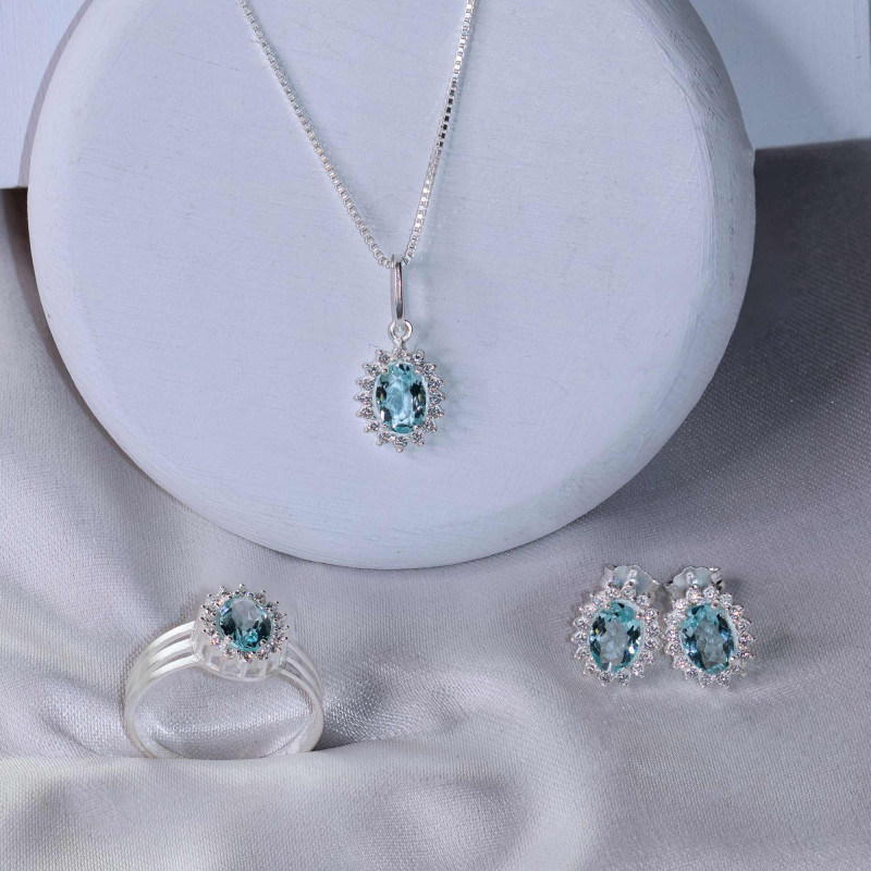 Anel de Prata Coleção Queens Oval Cristal Topázio Sky 5x7 e Zircônias Brancas