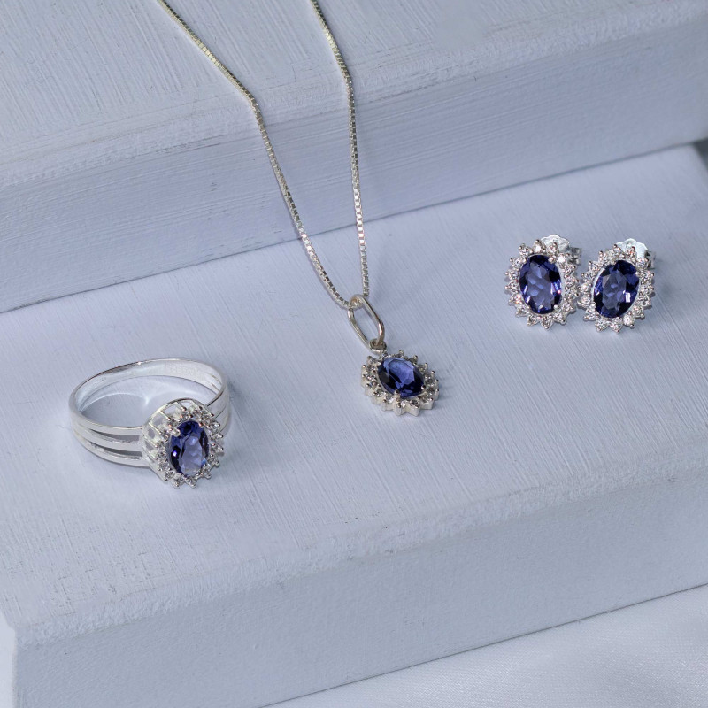 Pedras: 16 Zircônias Brancas de 1,25mm e 1 Cristal Oval  Tanzanita  5x7mm