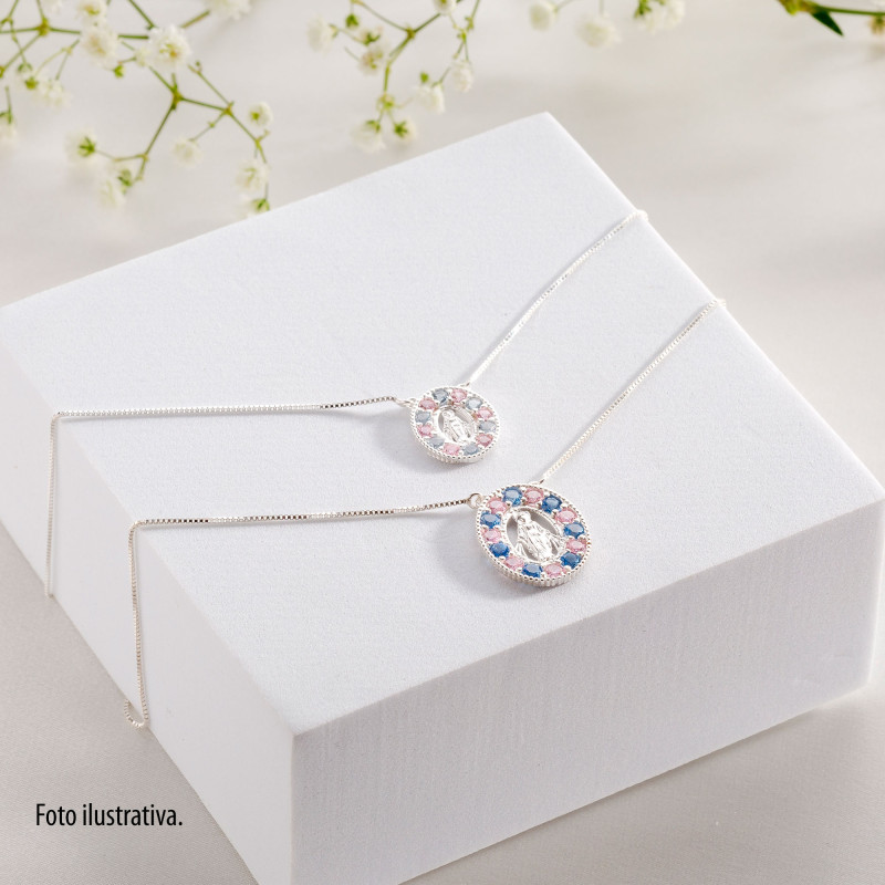 Colar de Prata Nossa Sra. Das Graças com Zircônias Azuis e Lilás 20x16mm