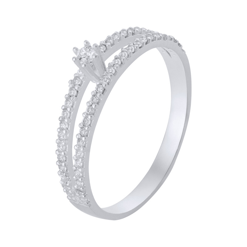 Um Lindo anel solitário com dois arcos cravejados de zircônias.