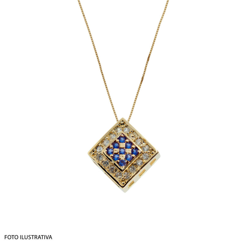 Pingente em Prata Revestido com Ouro 18K Quadrado com Zircônia Branca e Azul Centro 9x9mm 00145